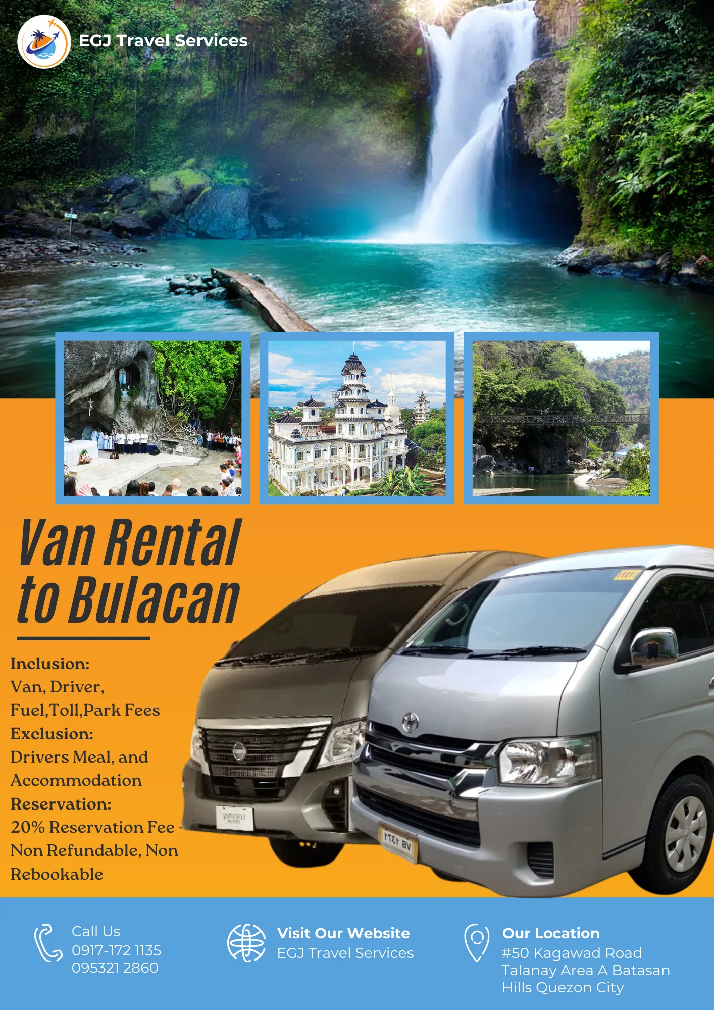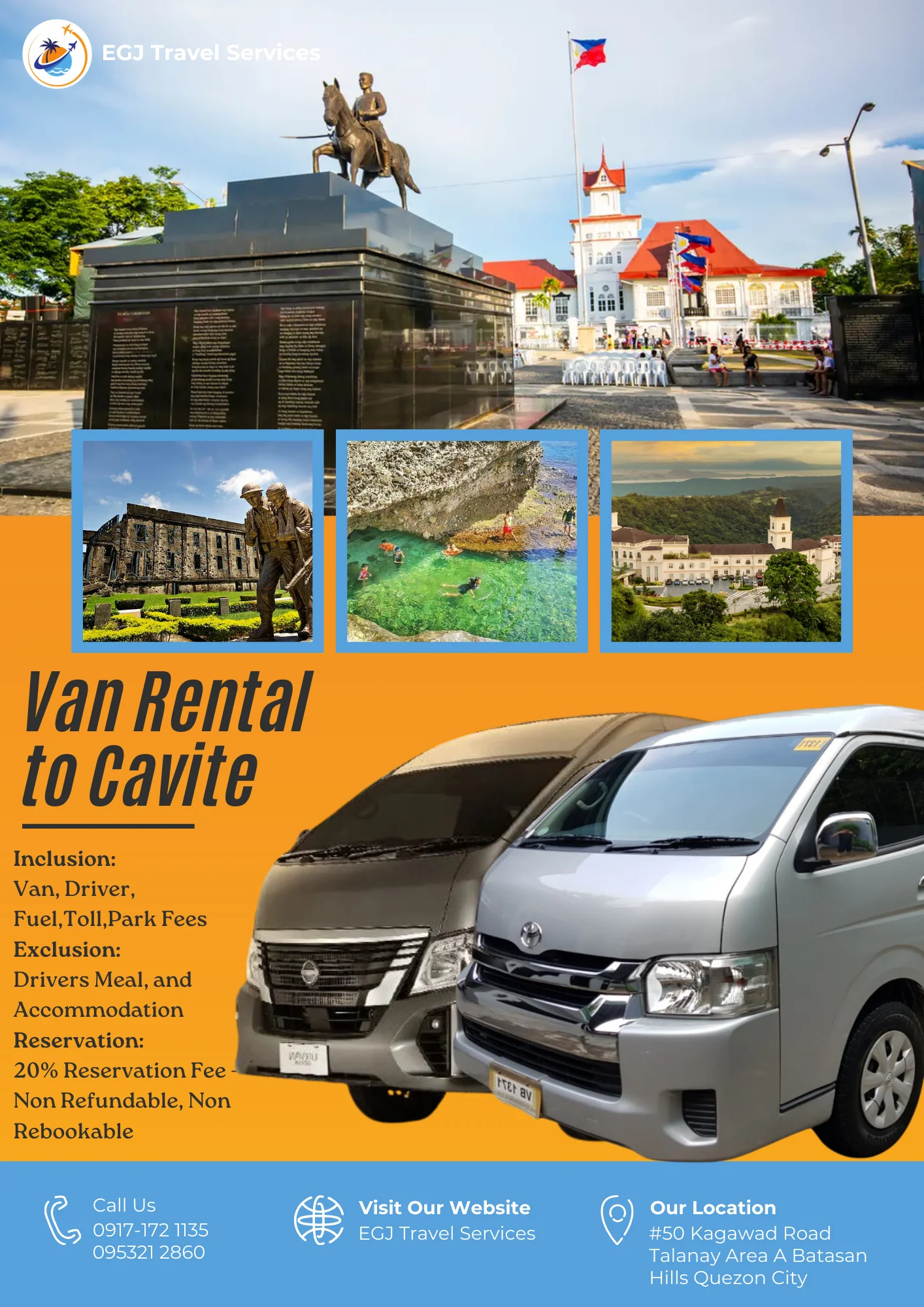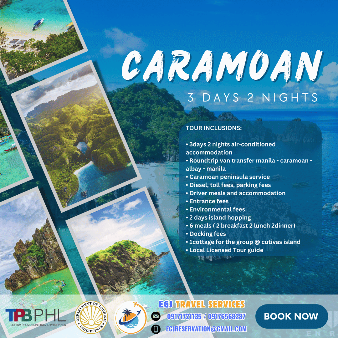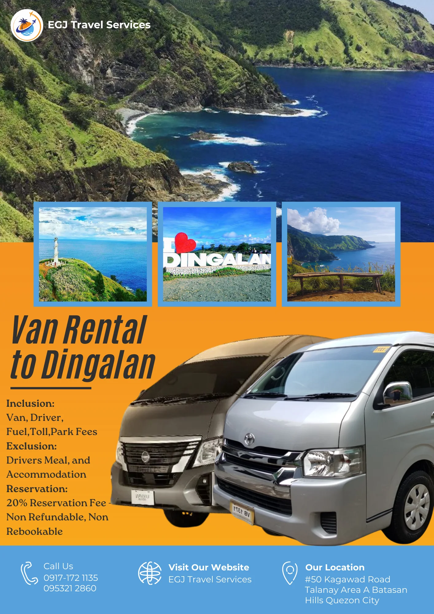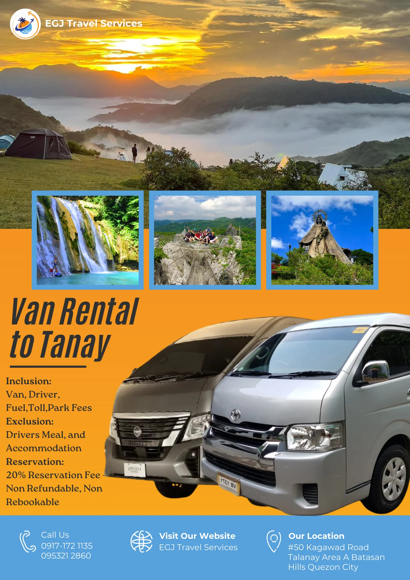Van Rental Ready to hit the road? With EGJ Travel Services, you can rent a spacious and comfortable van that’s perfect for your adventure. Whether you’re planning a family getaway, a group outing, or a solo exploration, we’ve got you covered. Manila-Airport-1Way​ Day Tour P2,700 Book Now Manila Day Tour P5,000 2 Days P9,000 3 Days P12,000 Book Now Tanay Day Tour P7,000 2 Days P10,000 3 Days P13,000 Book Now Laguna Day Tour P8,000 2 Days P11,000 3 Days P14,000 Book Now Tagaytay Day Tour P8,000 2 Days P 11,000 3 Days P14,000 Book Now Batangas Day Tour P9,000 2 Days P12,000 3 Days P15,000 Book Now Anawangin Zambales Day Tour P10,000 2 Days P 13,500 3 Days P 16,500 Book Now Villa Escudero Lucena Day Tour P10,000 2 Days P 13,500 3 Days P16,500 Book Now Bulacan Day Tour P6,500 2 Days P9,500 3 Days P12,500 Book Now Bataan Las Casas Day Tour P10,000 2 Days P13,000 3 Days P16,000 Book Now Bataan Mariveles Day Tour P10,500 2 Days P13,500 3 Days P16,500 Book Now Clark Airport Day Tour P6,500 2 Days P9,500 3 Days P12,500 Book Now Subic - San Fernando Exit Day Tour P9,000 2 Days P12,000 3 Days P15,000 Book Now Subic - Subic Exit Day Tour P10,000 2 Days P13,000 3 Days P16,000 Book Now Tarlac Capas Day Tour P9,000 2 Days P12,000 3 Days P15,000 Book Now Tarlac Botolan Day Tour P9,500 2 Days P12,500 3 Days P15,500 Book Now Nueva Ecija Minalungao Day Tour P10,000 2 Days P13,000 3 Days P17,000 Book Now Hundred Island + Bolinao Day Tour P11,000 2 Days P14,000 3 Days P18,000 Book Now Cabongaoan Pangasinan Day Tour P11,000 2 Days P14,000 3 Days P18,000 Book Now La Union Day Tour P12,000 2 Days P16,000 3 Days P20,000 Book Now Baguio Day Tour P12,000 2 Days P16,000 3 Days P20,000 Book Now Vigan Day Tour P14,000 2 Days 18,000 3 Days P22,000 Book Now Baler Day Tour P12,000 2 Days P16,000 3 Days P20,000 Book Now Dingalan Day Tour P12,500 2 Days P16,500 3 Days P20,500 Book Now Mount Ulap Day Tour P12,500 2 Days P16,500 3 Days P20,500 Book Now Potipot Day Tour P12,500 2 Days P16,500 3 Days P20,500 Book Now Cavite Day Tour P7000 2 Days P10,000 3 Days P13,000 Book Now Buscalan 2 Days P19,000 3 Days 23,000 Book Now Sagada 2 Days P19,000 3 Days 23,000 Book Now Calaguas Daet 2 Days P15,000 3 Days 18,000 Book Now Burias 2 Days P15,000 3 Days P18,000 Book Now Caramoan 2 Days P21,000 3 Days P25,000 Book Now Albay 2 Days P 19,000 3 Days P23,000 Book Now Sorsogon 2 Days P22,000 3 Days P26,000 Book Now Kalinga Apayao 2 Days P19,000 3 Days P23,000 Book Now Tuguegarao 2 Days P21,000 3 Days P25,000 Book Now Sta. Ana Cagayan 2 Days P23,000 3 Days P27,000 Book Now