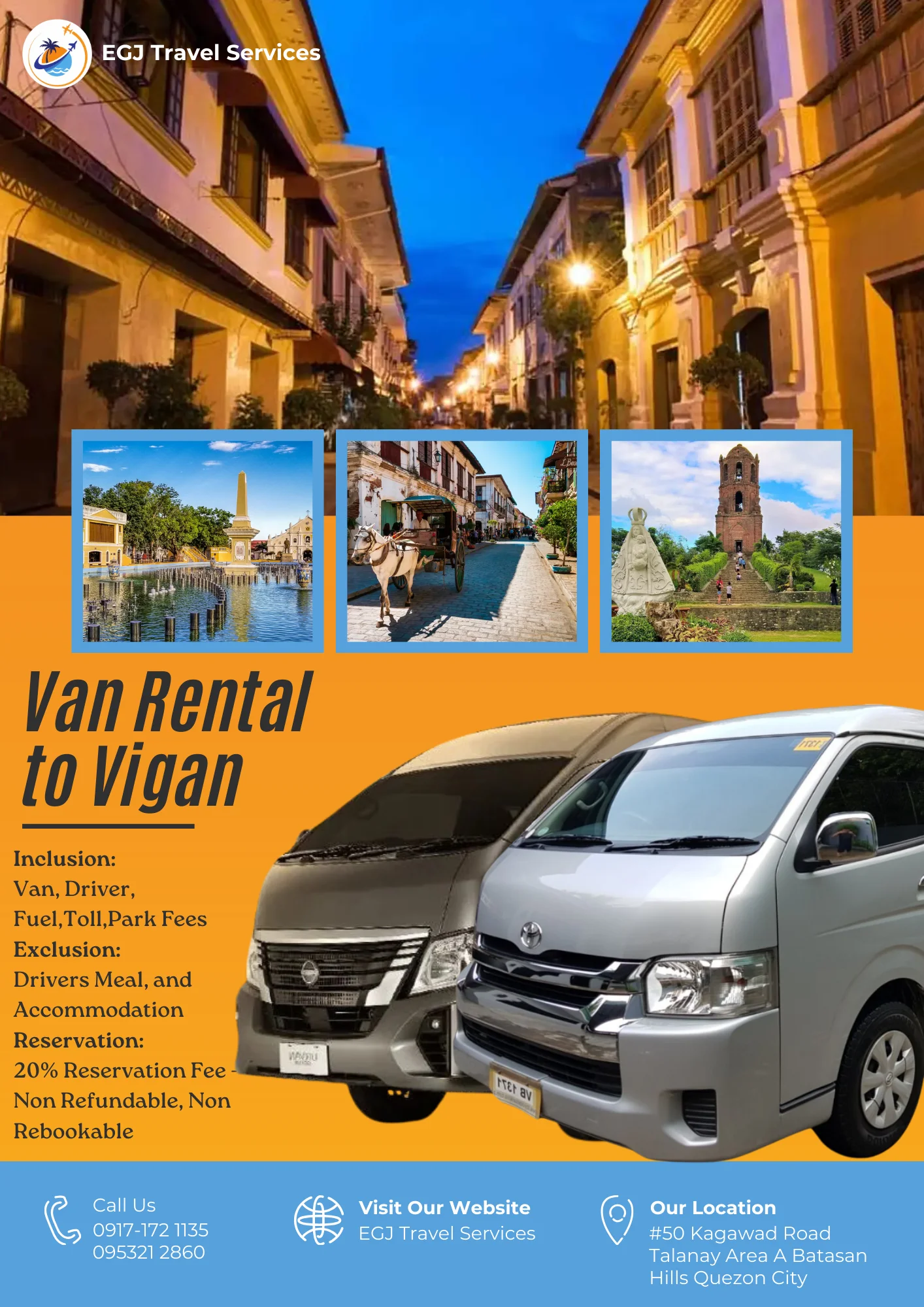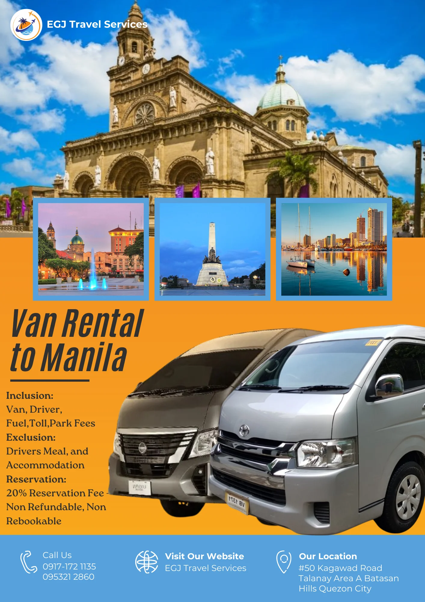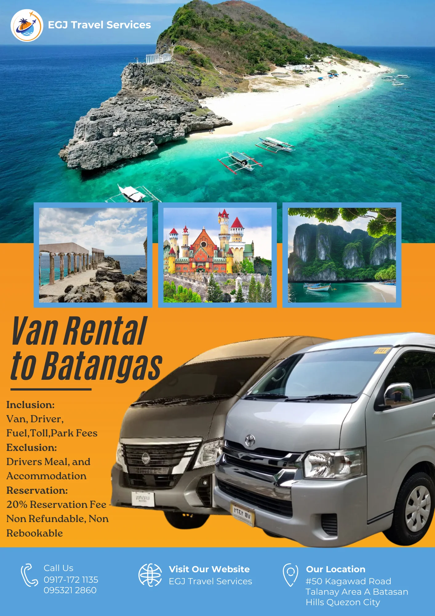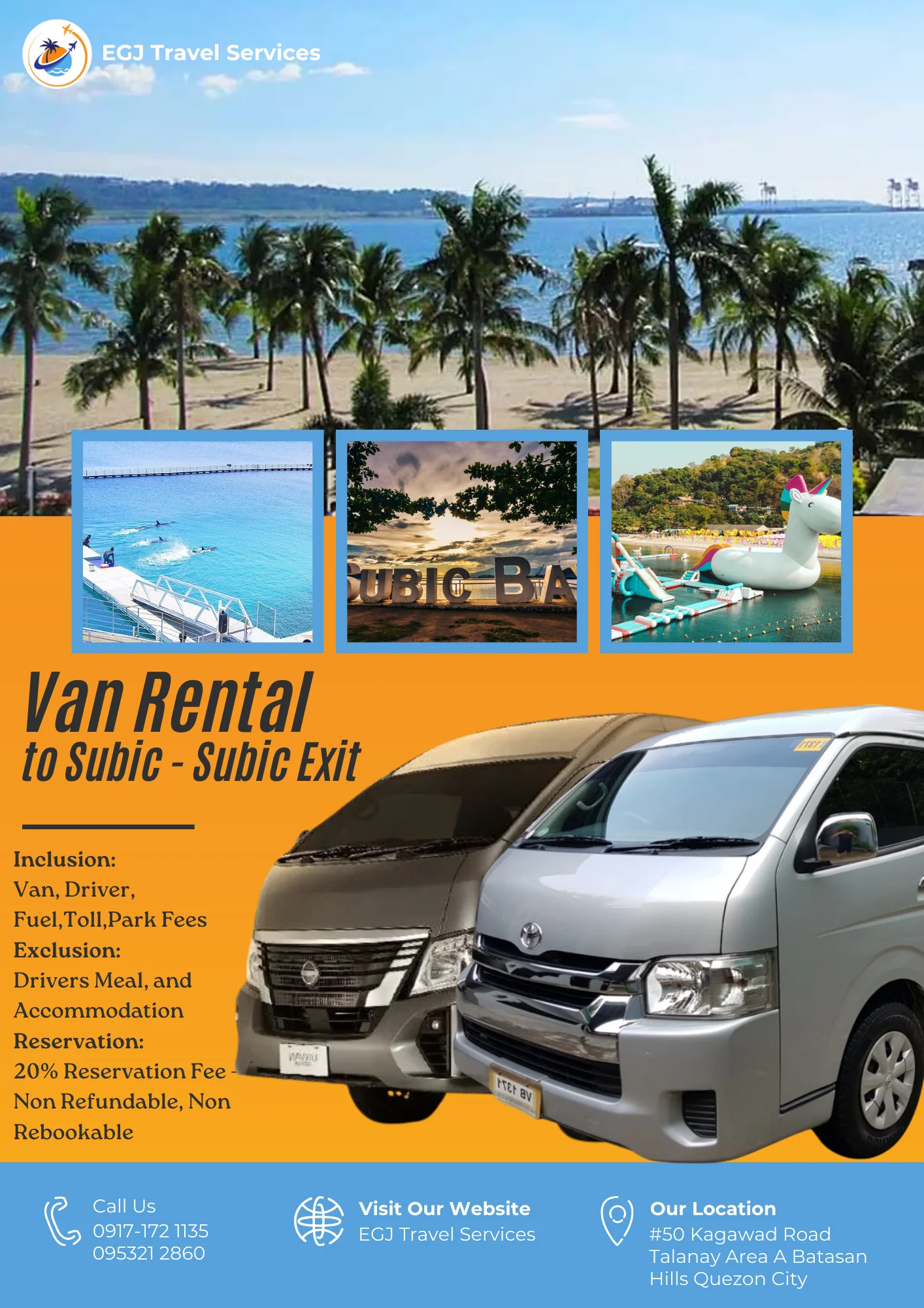 Van Rental Ready to hit the road? With EGJ Travel Services, you can rent a spacious and comfortable van that’s perfect for your adventure. Whether you’re planning a family getaway, a group outing, or a solo exploration, we’ve got you covered. Manila-Airport-1Way​ Day Tour P2,700 Book Now Manila Day Tour P5,000 2 Days P9,000 3 Days P12,000 Book Now Tanay Day Tour P7,000 2 Days P10,000 3 Days P13,000 Book Now Laguna Day Tour P8,000 2 Days P11,000 3 Days P14,000 Book Now Tagaytay Day Tour P8,000 2 Days P 11,000 3 Days P14,000 Book Now Batangas Day Tour P9,000 2 Days P12,000 3 Days P15,000 Book Now Anawangin Zambales Day Tour P10,000 2 Days P 13,500 3 Days P 16,500 Book Now Villa Escudero Lucena Day Tour P10,000 2 Days P 13,500 3 Days P16,500 Book Now Bulacan Day Tour P6,500 2 Days P9,500 3 Days P12,500 Book Now Bataan Las Casas Day Tour P10,000 2 Days P13,000 3 Days P16,000 Book Now Bataan Mariveles Day Tour P10,500 2 Days P13,500 3 Days P16,500 Book Now Clark Airport Day Tour P6,500 2 Days P9,500 3 Days P12,500 Book Now Subic - San Fernando Exit Day Tour P9,000 2 Days P12,000 3 Days P15,000 Book Now Subic - Subic Exit Day Tour P10,000 2 Days P13,000 3 Days P16,000 Book Now Tarlac Capas Day Tour P9,000 2 Days P12,000 3 Days P15,000 Book Now Tarlac Botolan Day Tour P9,500 2 Days P12,500 3 Days P15,500 Book Now Nueva Ecija Minalungao Day Tour P10,000 2 Days P13,000 3 Days P17,000 Book Now Hundred Island + Bolinao Day Tour P11,000 2 Days P14,000 3 Days P18,000 Book Now Cabongaoan Pangasinan Day Tour P11,000 2 Days P14,000 3 Days P18,000 Book Now La Union Day Tour P12,000 2 Days P16,000 3 Days P20,000 Book Now Baguio Day Tour P12,000 2 Days P16,000 3 Days P20,000 Book Now Vigan Day Tour P14,000 2 Days 18,000 3 Days P22,000 Book Now Baler Day Tour P12,000 2 Days P16,000 3 Days P20,000 Book Now Dingalan Day Tour P12,500 2 Days P16,500 3 Days P20,500 Book Now Mount Ulap Day Tour P12,500 2 Days P16,500 3 Days P20,500 Book Now Potipot Day Tour P12,500 2 Days P16,500 3 Days P20,500 Book Now Cavite Day Tour P7000 2 Days P10,000 3 Days P13,000 Book Now Buscalan 2 Days P19,000 3 Days 23,000 Book Now Sagada 2 Days P19,000 3 Days 23,000 Book Now Calaguas Daet 2 Days P15,000 3 Days 18,000 Book Now Burias 2 Days P15,000 3 Days P18,000 Book Now Caramoan 2 Days P21,000 3 Days P25,000 Book Now Albay 2 Days P 19,000 3 Days P23,000 Book Now Sorsogon 2 Days P22,000 3 Days P26,000 Book Now Kalinga Apayao 2 Days P19,000 3 Days P23,000 Book Now Tuguegarao 2 Days P21,000 3 Days P25,000 Book Now Sta. Ana Cagayan 2 Days P23,000 3 Days P27,000 Book Now
