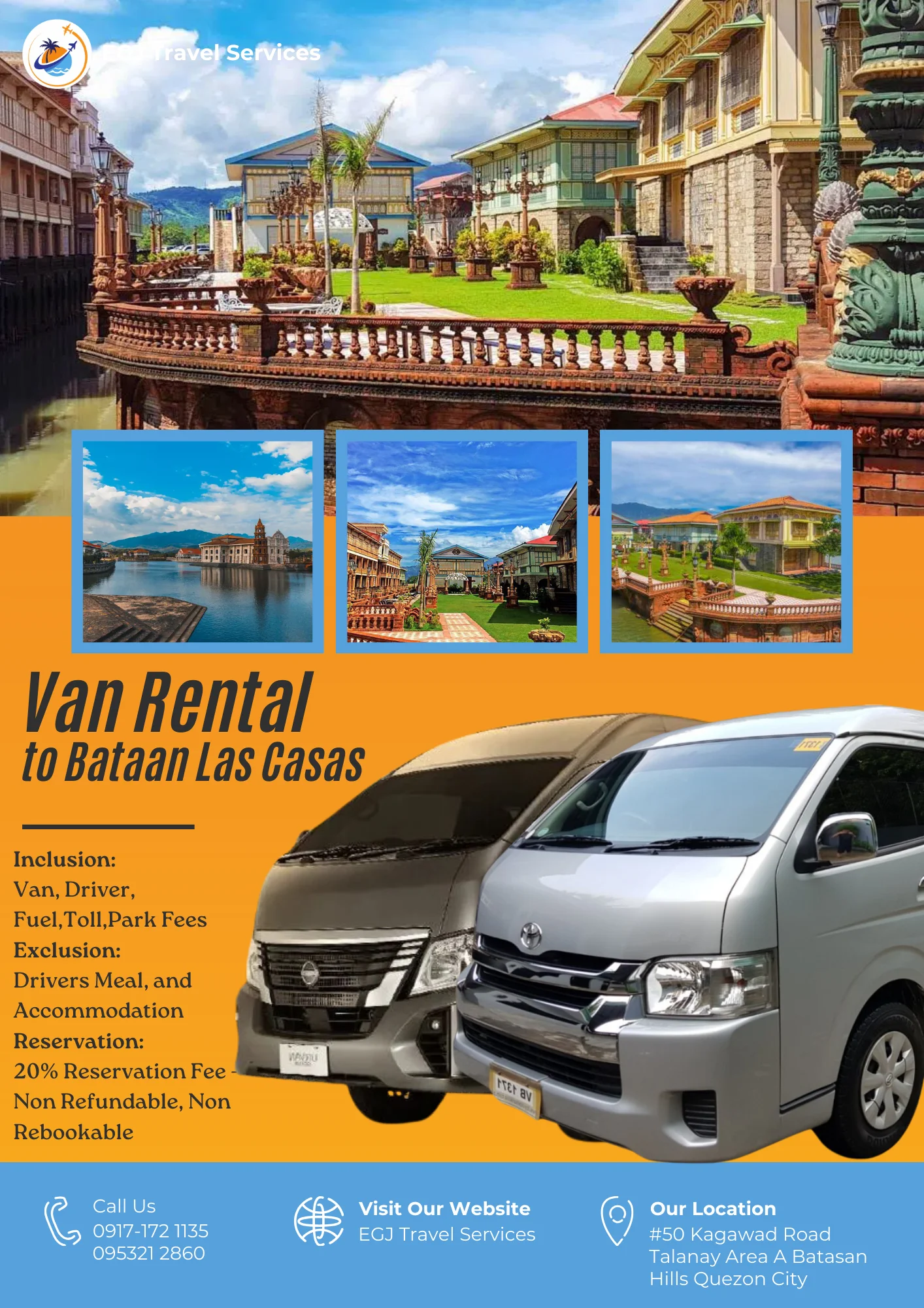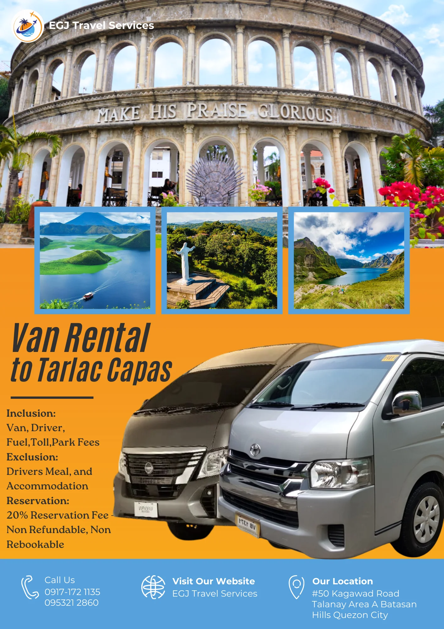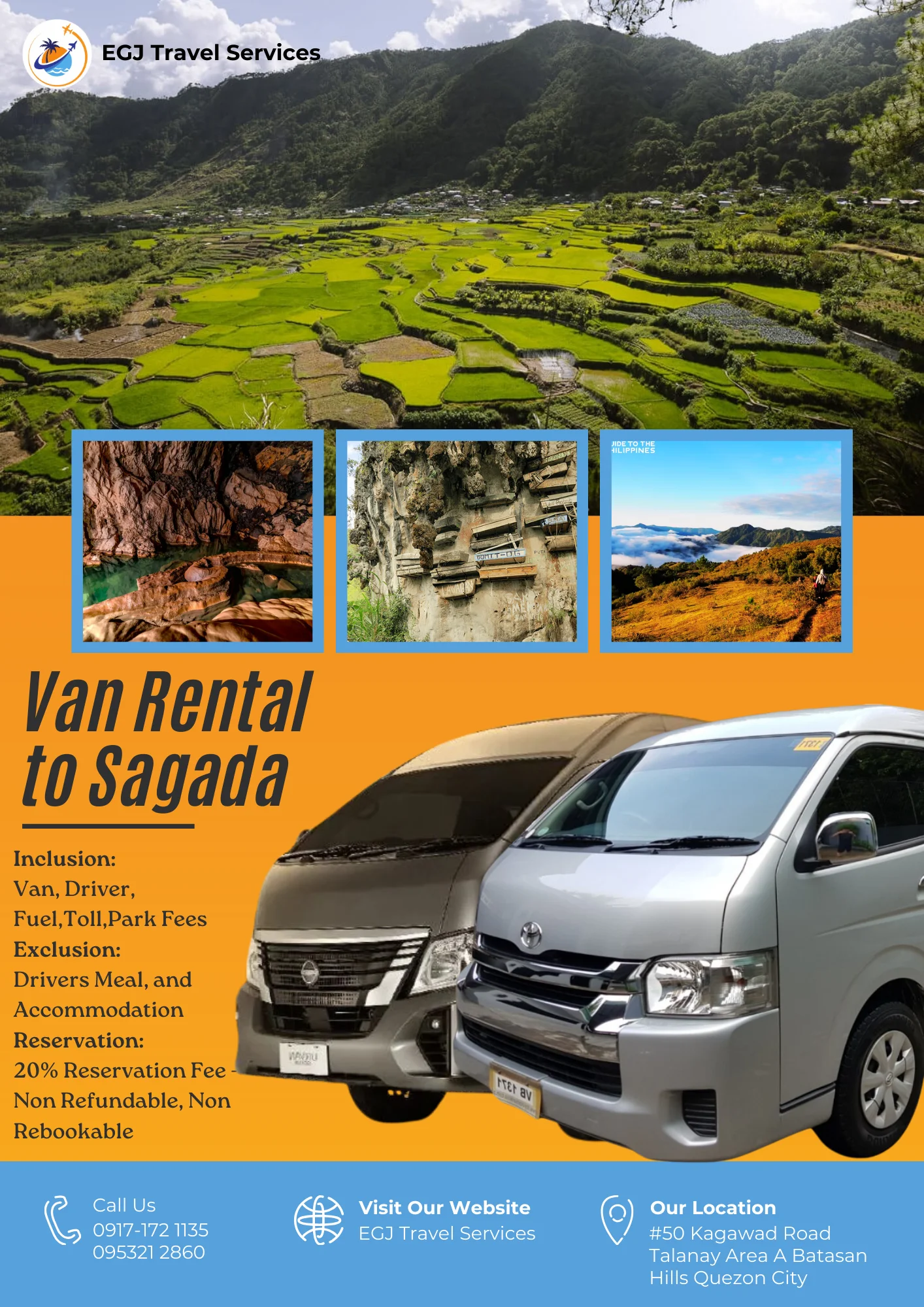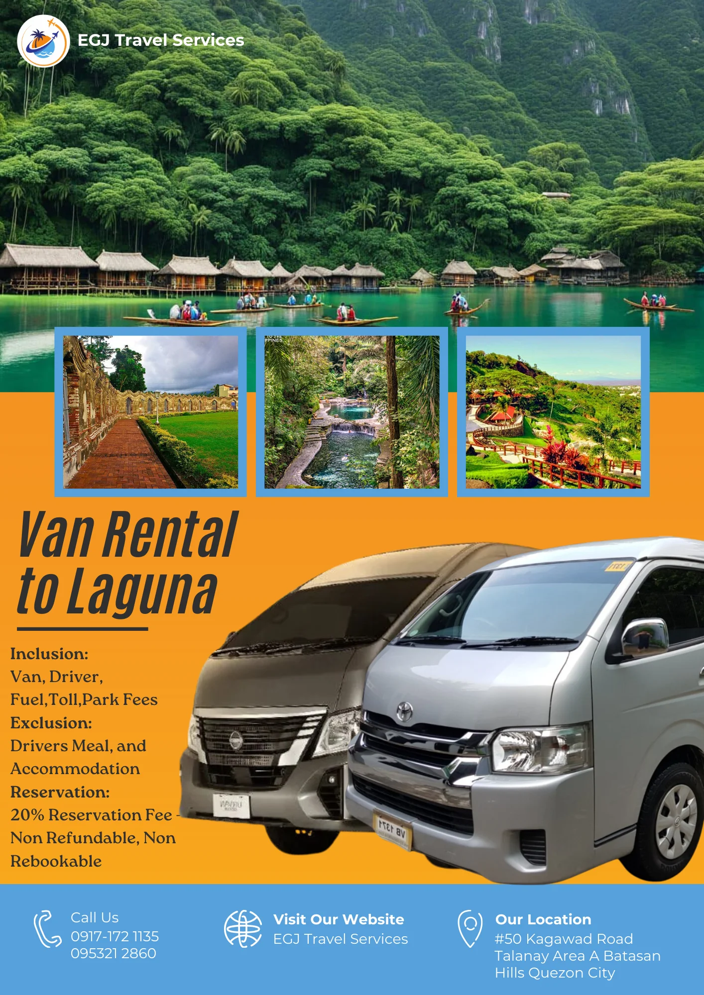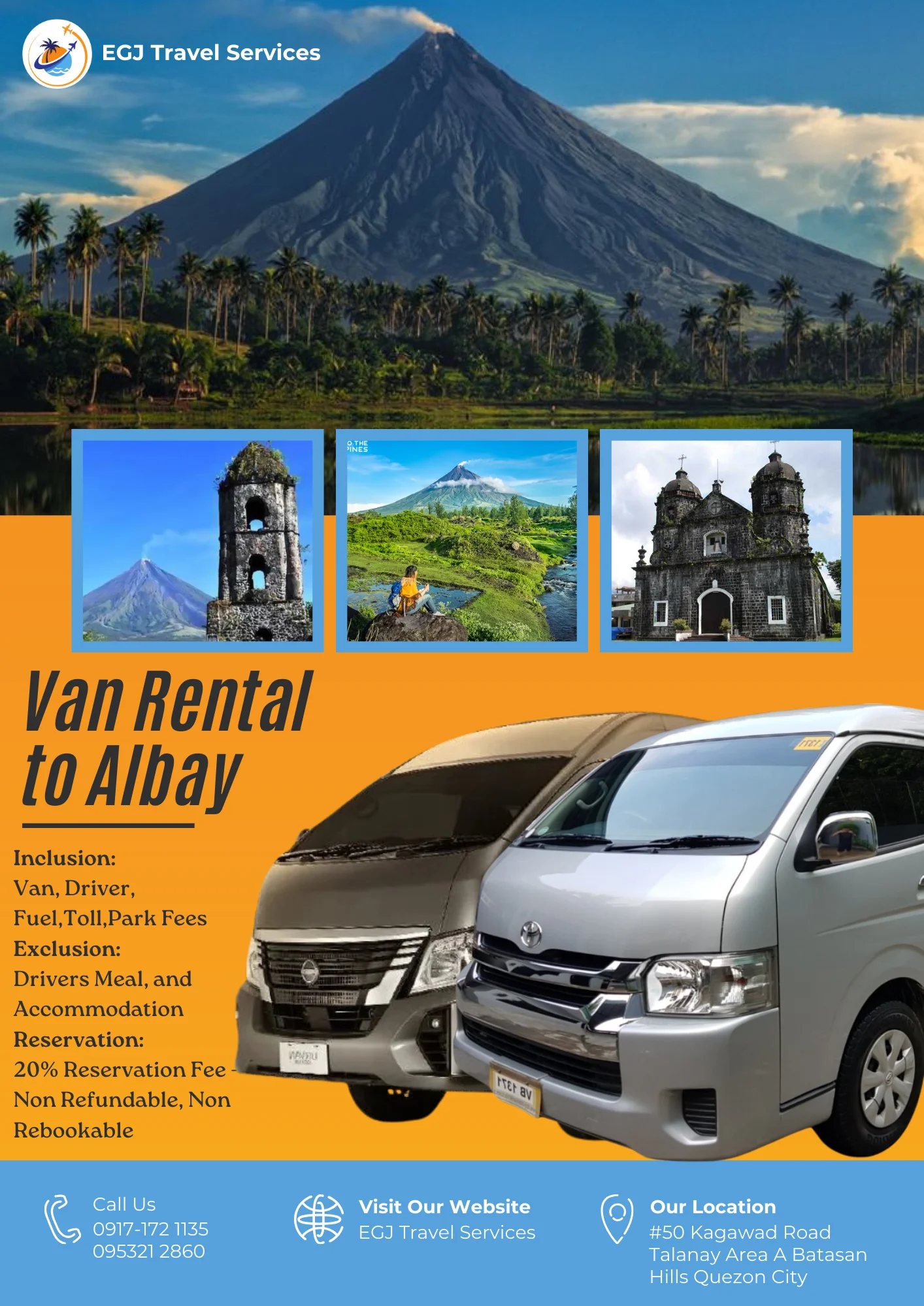 Van Rental Ready to hit the road? With EGJ Travel Services, you can rent a spacious and comfortable van that’s perfect for your adventure. Whether you’re planning a family getaway, a group outing, or a solo exploration, we’ve got you covered. Manila-Airport-1Way​ Day Tour P2,700 Book Now Manila Day Tour P5,000 2 Days P9,000 3 Days P12,000 Book Now Tanay Day Tour P7,000 2 Days P10,000 3 Days P13,000 Book Now Laguna Day Tour P8,000 2 Days P11,000 3 Days P14,000 Book Now Tagaytay Day Tour P8,000 2 Days P 11,000 3 Days P14,000 Book Now Batangas Day Tour P9,000 2 Days P12,000 3 Days P15,000 Book Now Anawangin Zambales Day Tour P10,000 2 Days P 13,500 3 Days P 16,500 Book Now Villa Escudero Lucena Day Tour P10,000 2 Days P 13,500 3 Days P16,500 Book Now Bulacan Day Tour P6,500 2 Days P9,500 3 Days P12,500 Book Now Bataan Las Casas Day Tour P10,000 2 Days P13,000 3 Days P16,000 Book Now Bataan Mariveles Day Tour P10,500 2 Days P13,500 3 Days P16,500 Book Now Clark Airport Day Tour P6,500 2 Days P9,500 3 Days P12,500 Book Now Subic - San Fernando Exit Day Tour P9,000 2 Days P12,000 3 Days P15,000 Book Now Subic - Subic Exit Day Tour P10,000 2 Days P13,000 3 Days P16,000 Book Now Tarlac Capas Day Tour P9,000 2 Days P12,000 3 Days P15,000 Book Now Tarlac Botolan Day Tour P9,500 2 Days P12,500 3 Days P15,500 Book Now Nueva Ecija Minalungao Day Tour P10,000 2 Days P13,000 3 Days P17,000 Book Now Hundred Island + Bolinao Day Tour P11,000 2 Days P14,000 3 Days P18,000 Book Now Cabongaoan Pangasinan Day Tour P11,000 2 Days P14,000 3 Days P18,000 Book Now La Union Day Tour P12,000 2 Days P16,000 3 Days P20,000 Book Now Baguio Day Tour P12,000 2 Days P16,000 3 Days P20,000 Book Now Vigan Day Tour P14,000 2 Days 18,000 3 Days P22,000 Book Now Baler Day Tour P12,000 2 Days P16,000 3 Days P20,000 Book Now Dingalan Day Tour P12,500 2 Days P16,500 3 Days P20,500 Book Now Mount Ulap Day Tour P12,500 2 Days P16,500 3 Days P20,500 Book Now Potipot Day Tour P12,500 2 Days P16,500 3 Days P20,500 Book Now Cavite Day Tour P7000 2 Days P10,000 3 Days P13,000 Book Now Buscalan 2 Days P19,000 3 Days 23,000 Book Now Sagada 2 Days P19,000 3 Days 23,000 Book Now Calaguas Daet 2 Days P15,000 3 Days 18,000 Book Now Burias 2 Days P15,000 3 Days P18,000 Book Now Caramoan 2 Days P21,000 3 Days P25,000 Book Now Albay 2 Days P 19,000 3 Days P23,000 Book Now Sorsogon 2 Days P22,000 3 Days P26,000 Book Now Kalinga Apayao 2 Days P19,000 3 Days P23,000 Book Now Tuguegarao 2 Days P21,000 3 Days P25,000 Book Now Sta. Ana Cagayan 2 Days P23,000 3 Days P27,000 Book Now