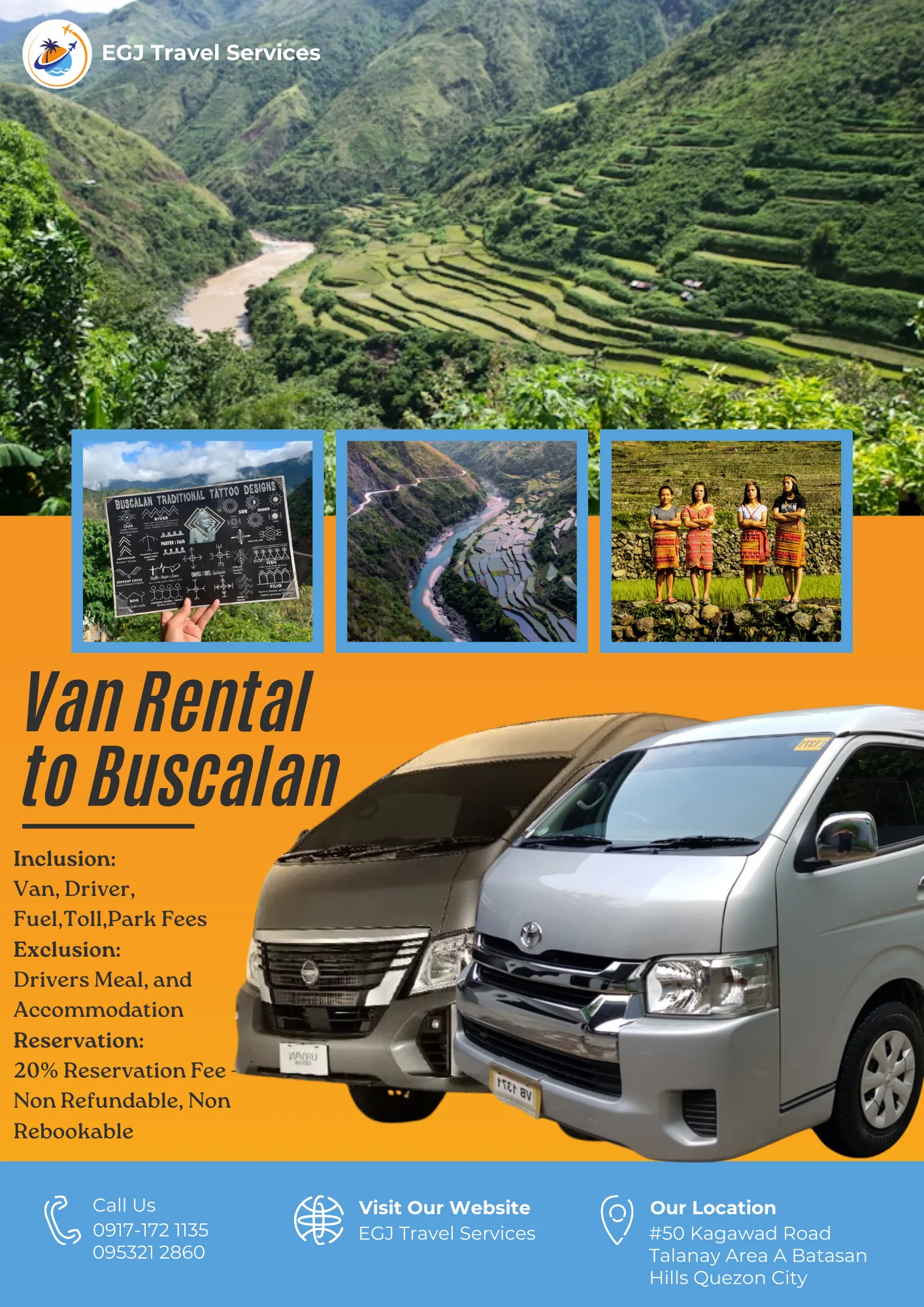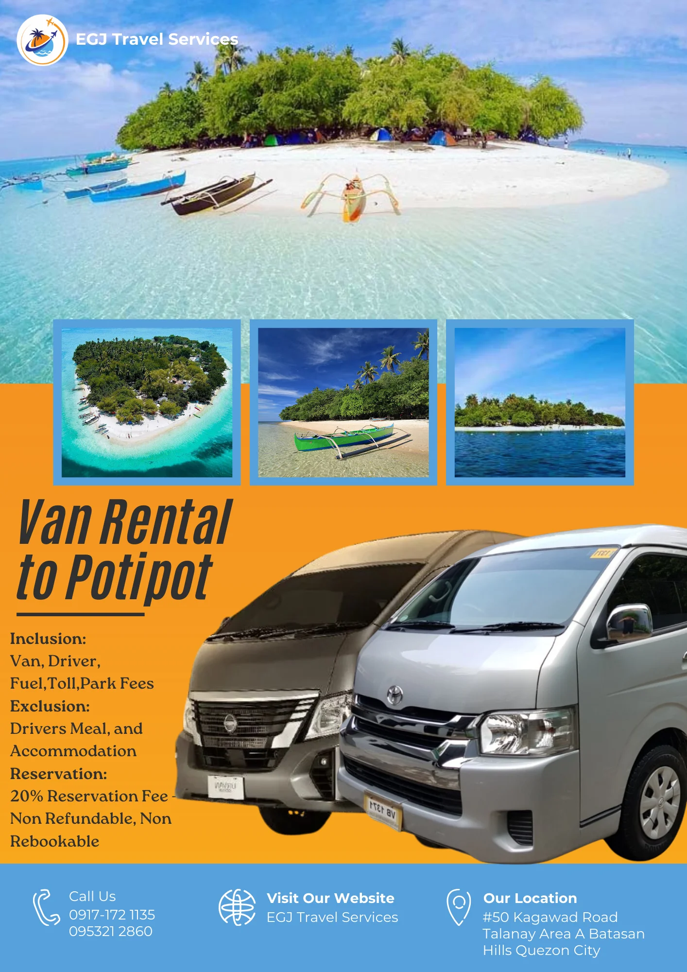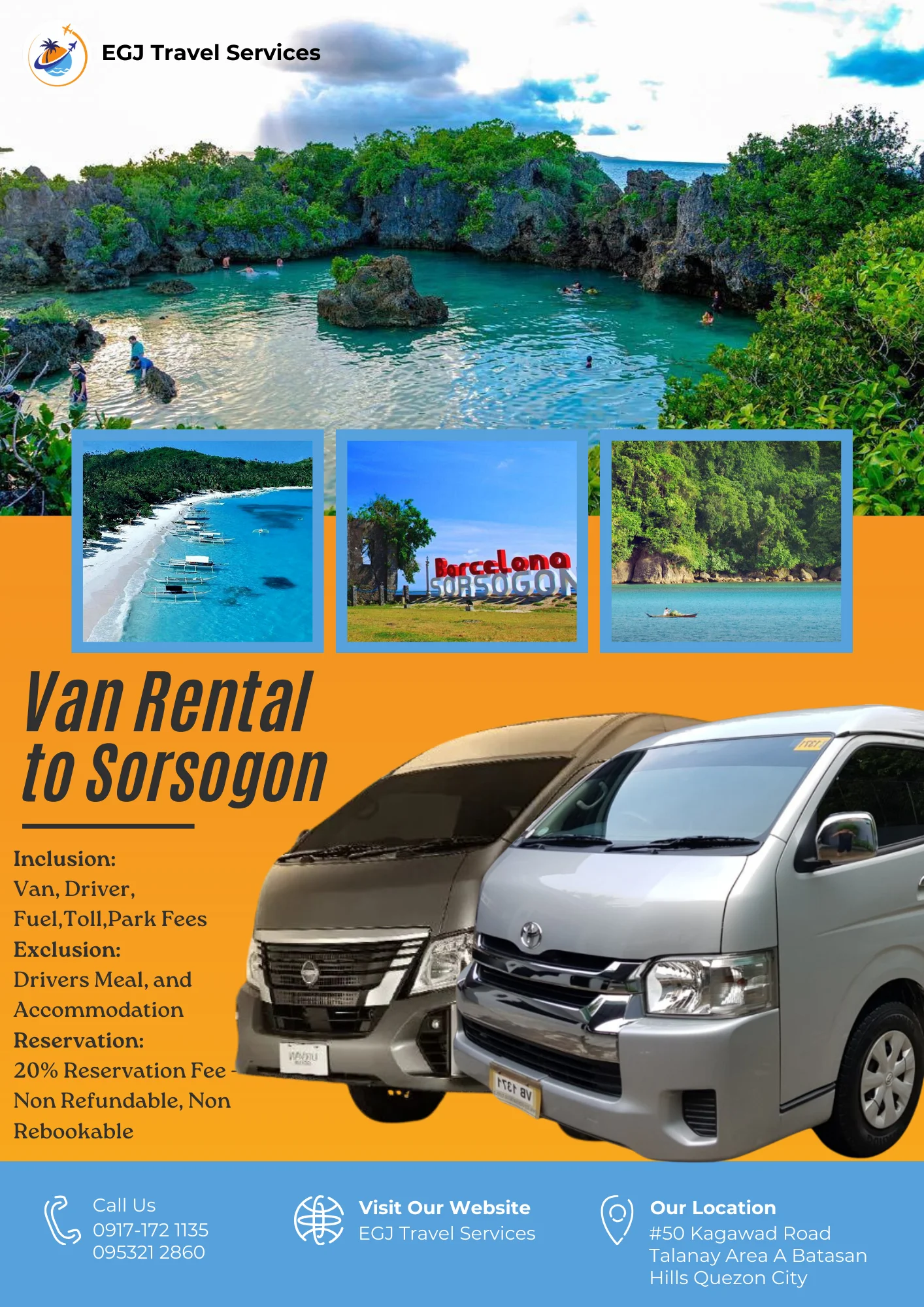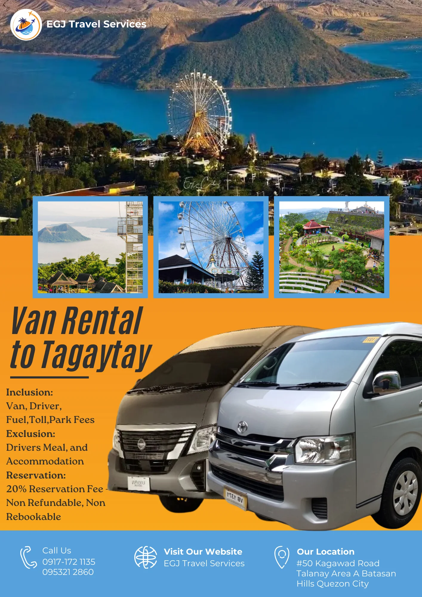 Van Rental Ready to hit the road? With EGJ Travel Services, you can rent a spacious and comfortable van that’s perfect for your adventure. Whether you’re planning a family getaway, a group outing, or a solo exploration, we’ve got you covered. Manila-Airport-1Way​ Day Tour P2,700 Book Now Manila Day Tour P5,000 2 Days P9,000 3 Days P12,000 Book Now Tanay Day Tour P7,000 2 Days P10,000 3 Days P13,000 Book Now Laguna Day Tour P8,000 2 Days P11,000 3 Days P14,000 Book Now Tagaytay Day Tour P8,000 2 Days P 11,000 3 Days P14,000 Book Now Batangas Day Tour P9,000 2 Days P12,000 3 Days P15,000 Book Now Anawangin Zambales Day Tour P10,000 2 Days P 13,500 3 Days P 16,500 Book Now Villa Escudero Lucena Day Tour P10,000 2 Days P 13,500 3 Days P16,500 Book Now Bulacan Day Tour P6,500 2 Days P9,500 3 Days P12,500 Book Now Bataan Las Casas Day Tour P10,000 2 Days P13,000 3 Days P16,000 Book Now Bataan Mariveles Day Tour P10,500 2 Days P13,500 3 Days P16,500 Book Now Clark Airport Day Tour P6,500 2 Days P9,500 3 Days P12,500 Book Now Subic - San Fernando Exit Day Tour P9,000 2 Days P12,000 3 Days P15,000 Book Now Subic - Subic Exit Day Tour P10,000 2 Days P13,000 3 Days P16,000 Book Now Tarlac Capas Day Tour P9,000 2 Days P12,000 3 Days P15,000 Book Now Tarlac Botolan Day Tour P9,500 2 Days P12,500 3 Days P15,500 Book Now Nueva Ecija Minalungao Day Tour P10,000 2 Days P13,000 3 Days P17,000 Book Now Hundred Island + Bolinao Day Tour P11,000 2 Days P14,000 3 Days P18,000 Book Now Cabongaoan Pangasinan Day Tour P11,000 2 Days P14,000 3 Days P18,000 Book Now La Union Day Tour P12,000 2 Days P16,000 3 Days P20,000 Book Now Baguio Day Tour P12,000 2 Days P16,000 3 Days P20,000 Book Now Vigan Day Tour P14,000 2 Days 18,000 3 Days P22,000 Book Now Baler Day Tour P12,000 2 Days P16,000 3 Days P20,000 Book Now Dingalan Day Tour P12,500 2 Days P16,500 3 Days P20,500 Book Now Mount Ulap Day Tour P12,500 2 Days P16,500 3 Days P20,500 Book Now Potipot Day Tour P12,500 2 Days P16,500 3 Days P20,500 Book Now Cavite Day Tour P7000 2 Days P10,000 3 Days P13,000 Book Now Buscalan 2 Days P19,000 3 Days 23,000 Book Now Sagada 2 Days P19,000 3 Days 23,000 Book Now Calaguas Daet 2 Days P15,000 3 Days 18,000 Book Now Burias 2 Days P15,000 3 Days P18,000 Book Now Caramoan 2 Days P21,000 3 Days P25,000 Book Now Albay 2 Days P 19,000 3 Days P23,000 Book Now Sorsogon 2 Days P22,000 3 Days P26,000 Book Now Kalinga Apayao 2 Days P19,000 3 Days P23,000 Book Now Tuguegarao 2 Days P21,000 3 Days P25,000 Book Now Sta. Ana Cagayan 2 Days P23,000 3 Days P27,000 Book Now